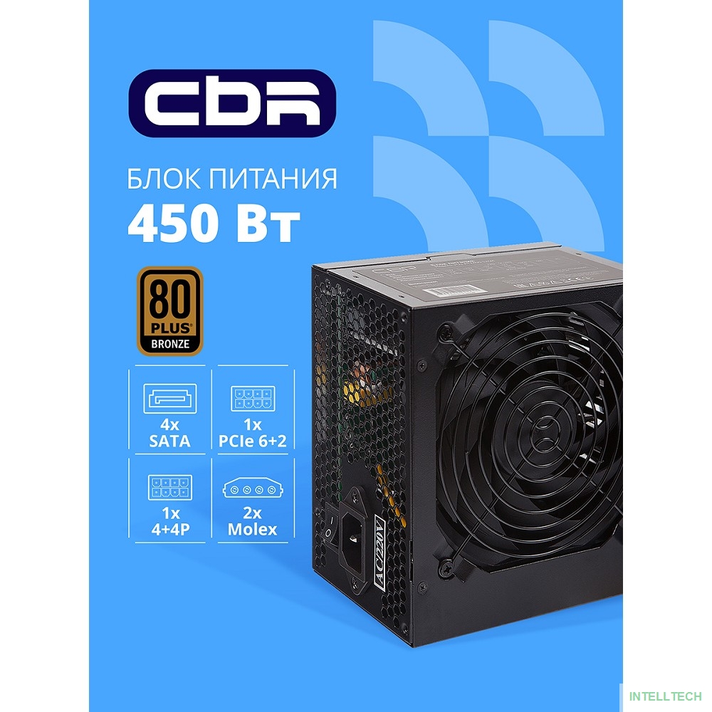 название: Блок питания CBR ATX 450W 80+ Bronze, DC-DC, APFC, 0.6mm, 24pin, 1*8-pin(4+4P), 1*6+2pin, 4*SATA, 2*IDE, 12cm fan, 1.5м кабель питания, черный [PSU-ATX450-12GM] BOX