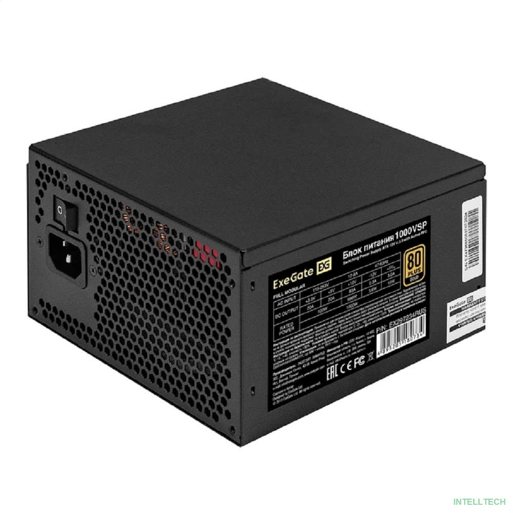 rusName: [Блок питания] Exegate EX297234RUS Блок питания 1000W ExeGate 80 PLUS® GOLD 1000VSP FC (ATX3.0, APFC, КПД 90% (80 PLUS GOLD), 120mm fan, 24pin, 2x(4+4)pin, PCIE5.0/12VHPWR, 4xPCI-E, 6xSATA, 3xIDE, 1xFDD, Full Cable