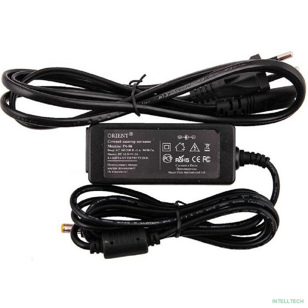rusName: [Аксессуар к ноутбуку] ORIENT PA-06, Блок питания DC 12V, 3.0A, стабилизированный, защита от КЗ и перегрузки ( Imax~3.5А ), вилка с кабелем (29505 )