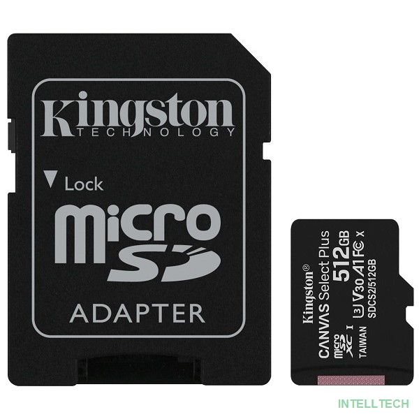 название: Micro SecureDigital 512Gb Kingston Class 10 UHS-I U3 Canvas Select Plus (SD адаптер) 100MB/s SDCS2/512GB