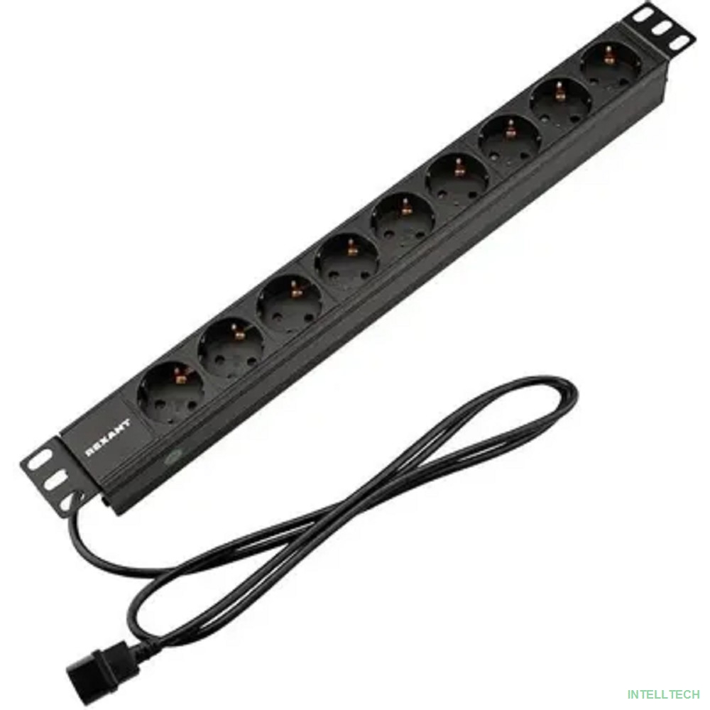 название: Rexant (04-0305-1) Блок распределения питания для 19" шкафов, горизонтальный, 9 розеток СЕЕ 7/4, 10A, без выкл, алюм корп, шнур 2м, вилка C14